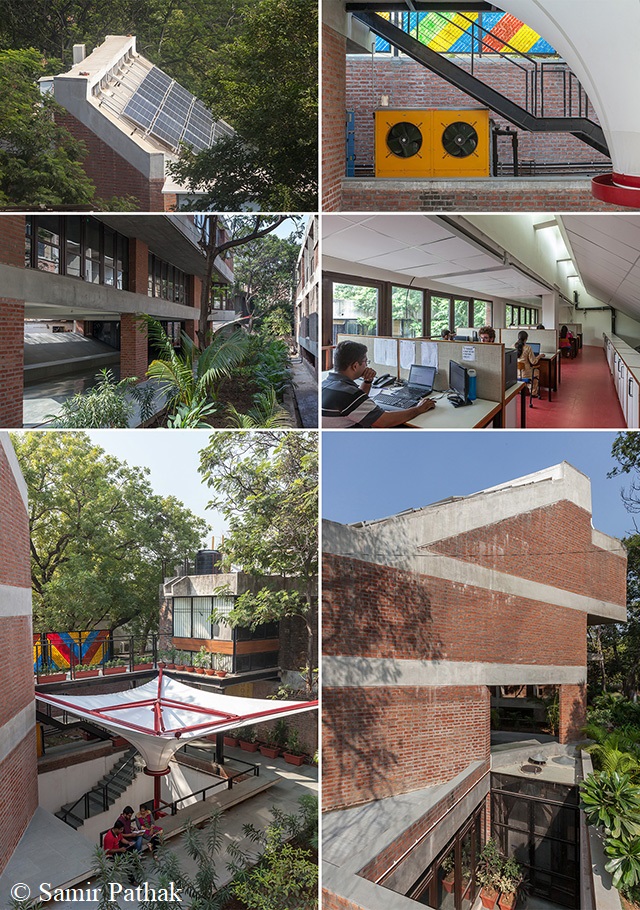 To start with, a thorough analysis was done of Ahmedabad’s climate and the site on which the building was proposed to be constructed. An integrated and interactive design approach was considered suitable for designing the building. An extensive pre-design analysis was done to comprehend the challenges and come up with applicable solutions for building massing, orientation, day-lighting and artificial lighting inside the building, natural ventilation, occupant thermal comfort, HVAC and renewable energy systems. Different options were considered for building design and simulation models were designed for in-depth and detailed analysis. After a substantial amount of brainstorming by the academia and industry experts, the design was finalized and construction began in September 2012 and finished in March 2015.